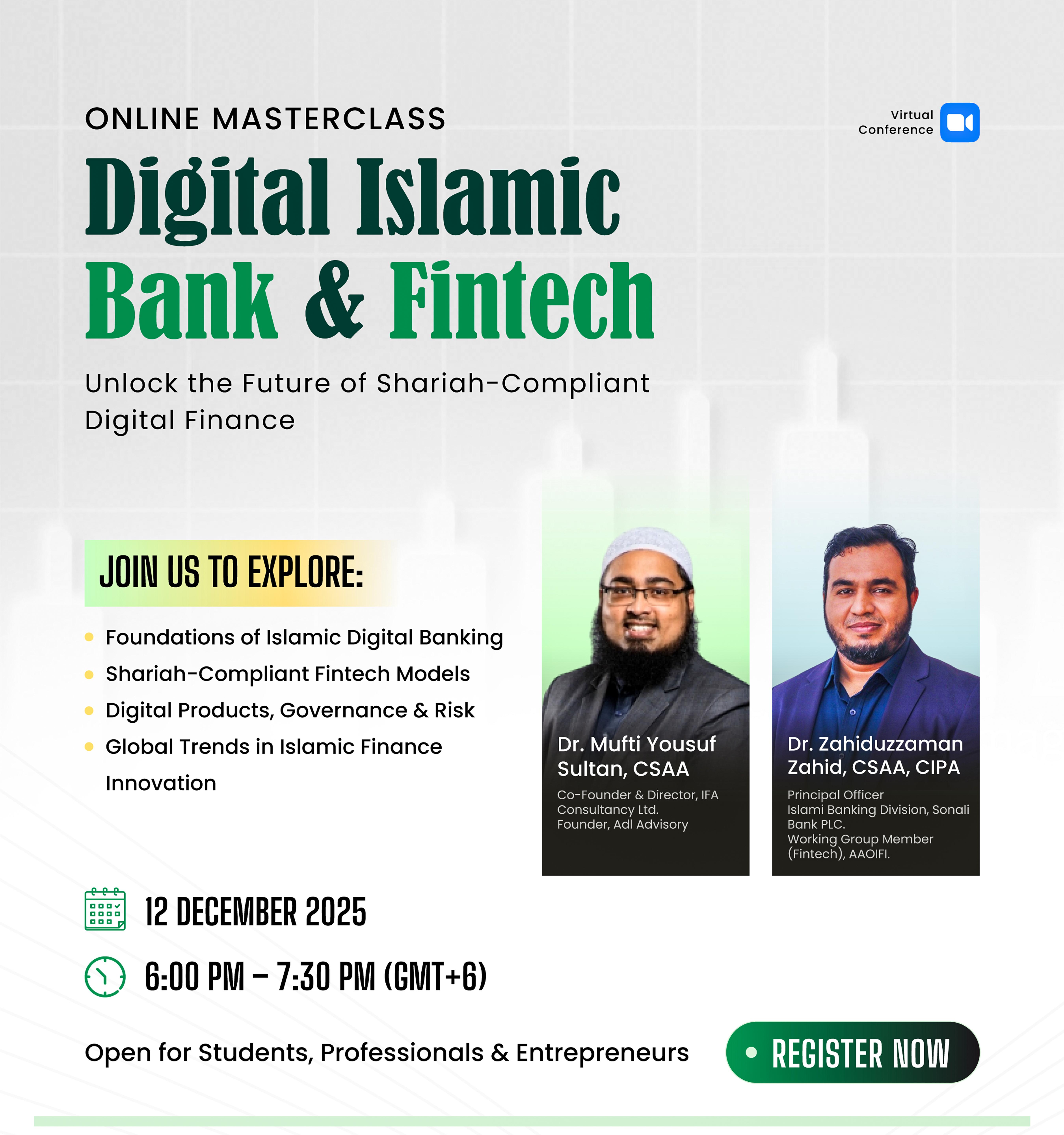 Dr. Mufti Yousuf Sultan is a seasoned expert in Islamic finance with 15+ years of experience in Shariah advisory, audit, consultancy, and training. He holds a PhD and MSc in Islamic Finance (INCEIF), CSAA (AAOIFI), CIFE (Ethica), and a Mufti degree in Islamic jurisprudence. He is a registered Shariah adviser with Malaysia’s SC and Labuan FSA, and serves on several Shariah committees including Standard Chartered Saadiq and BSEC. Dr. Yousuf is the Founder & CEO of Adl Advisory (Malaysia) and Co-Founder of IFA Consultancy (Bangladesh), both focused on Shariah-compliant finance and training. He speaks regularly at AAOIFI, World Bank, CIBAFI, and others. He is a member of AAOIFI working groups and ASAS, CIIF, and ICDM. A visiting lecturer at USIM, he co-authored work with Tan Sri Dr. Zeti and received the INCEIF President Award and BAFF Award in 2023 for his leadership in Islamic finance.