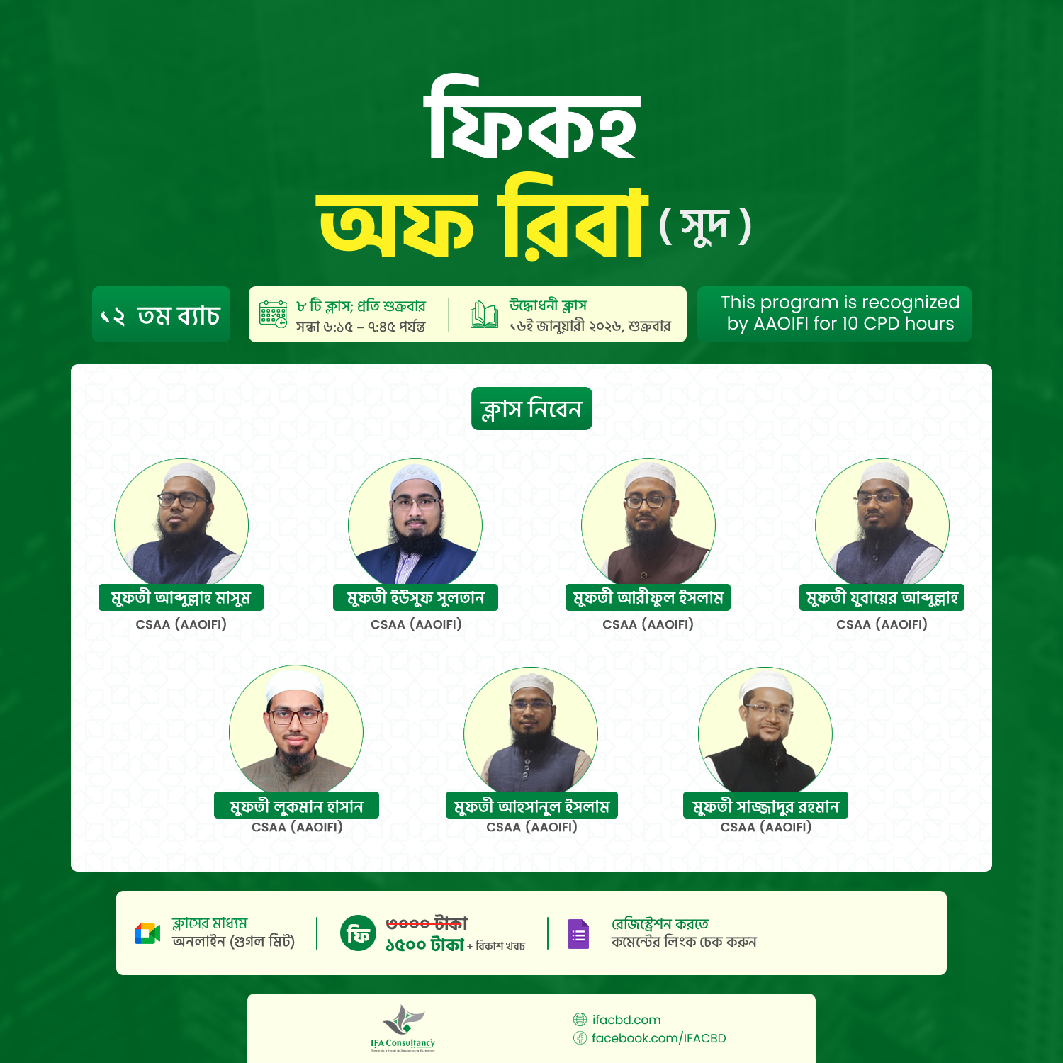 Mufti Abdullah Masum, CSAA is a leading Shariah scholar and Islamic finance expert from Bangladesh, with over 12 years of experience in teaching, research, and consultancy. He is the Vice Chairman of the Shariah Supervisory Board at Social Islami Bank PLC and Shariah Consultant at Bengal Islami Life Insurance Ltd. As the first Bangladeshi to earn the CSAA certification from AAOIFI, he brings deep expertise in Fiqh-ul Mu’amalat, Islamic banking, Takaful, and Sukuk. He is the Founder & Director of IFA Consultancy Ltd. and has trained professionals at institutions like Bangladesh Bank. A regular presenter at NACIF and a published author, Mufti Masum has contributed to leading journals on Islamic finance. His mission is to bridge classical Islamic jurisprudence with modern financial needs.